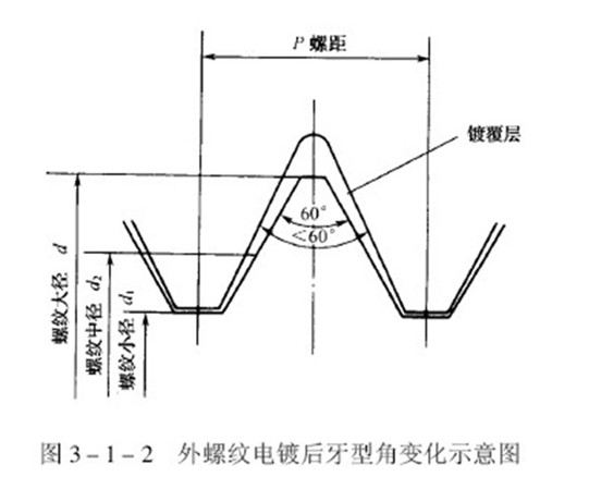 帶有普通螺紋的零件和緊固件,常遇到鍍覆后發(fā)生配合障礙的問題。當(dāng)螺紋進(jìn)行電鍍時(shí),螺紋的牙尖部位和谷底部位的鍍層厚度是不一樣的,牙尖部位的鍍層厚度將明顯的大于谷底部位,隨著鍍層厚度的增加,它們之間的差異會(huì)越來越大,因此,螺紋的牙型角度變小,如圖所示。隨著螺紋直徑和螺距的不同,雖然牙尖和谷底部位鍍層厚度差異的比值也不同,但是隨著鍍層厚度增加,牙型角角度變小的傾向是始終如此的。螺紋直徑和螺距大一些,精度低一些,螺紋鍍后配合障礙就少一些,反之則多。實(shí)踐證明,螺紋電鍍后出現(xiàn)配合障礙的主要原因是牙型角鍍后的變形,其次才是鍍層厚度因素。